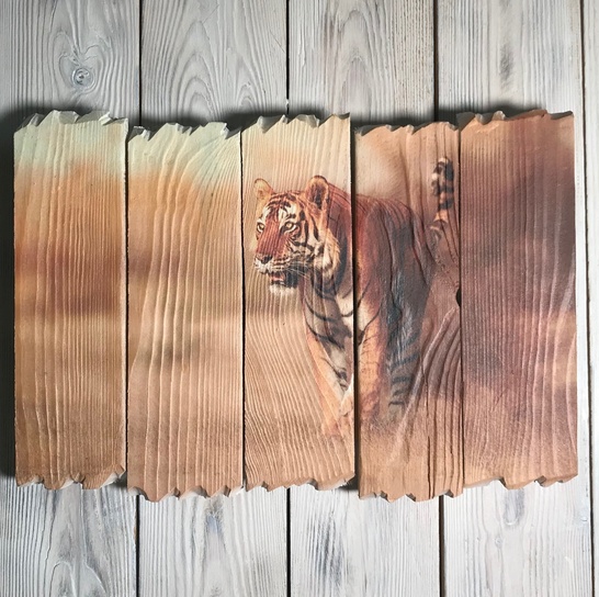 Специальные методы подготовки и обработки древесины позволяют сделать основу для изображения красивой и долговечной. Картина на досках защищена от деформации, поражения грибком и вредителями.