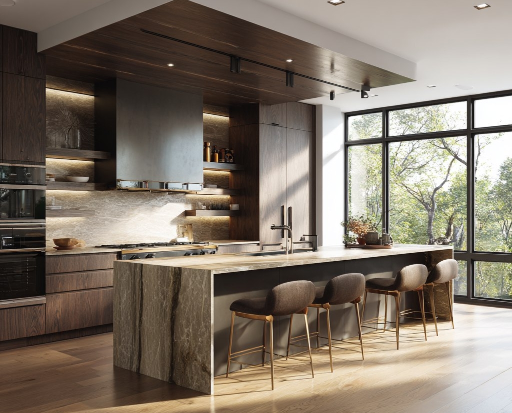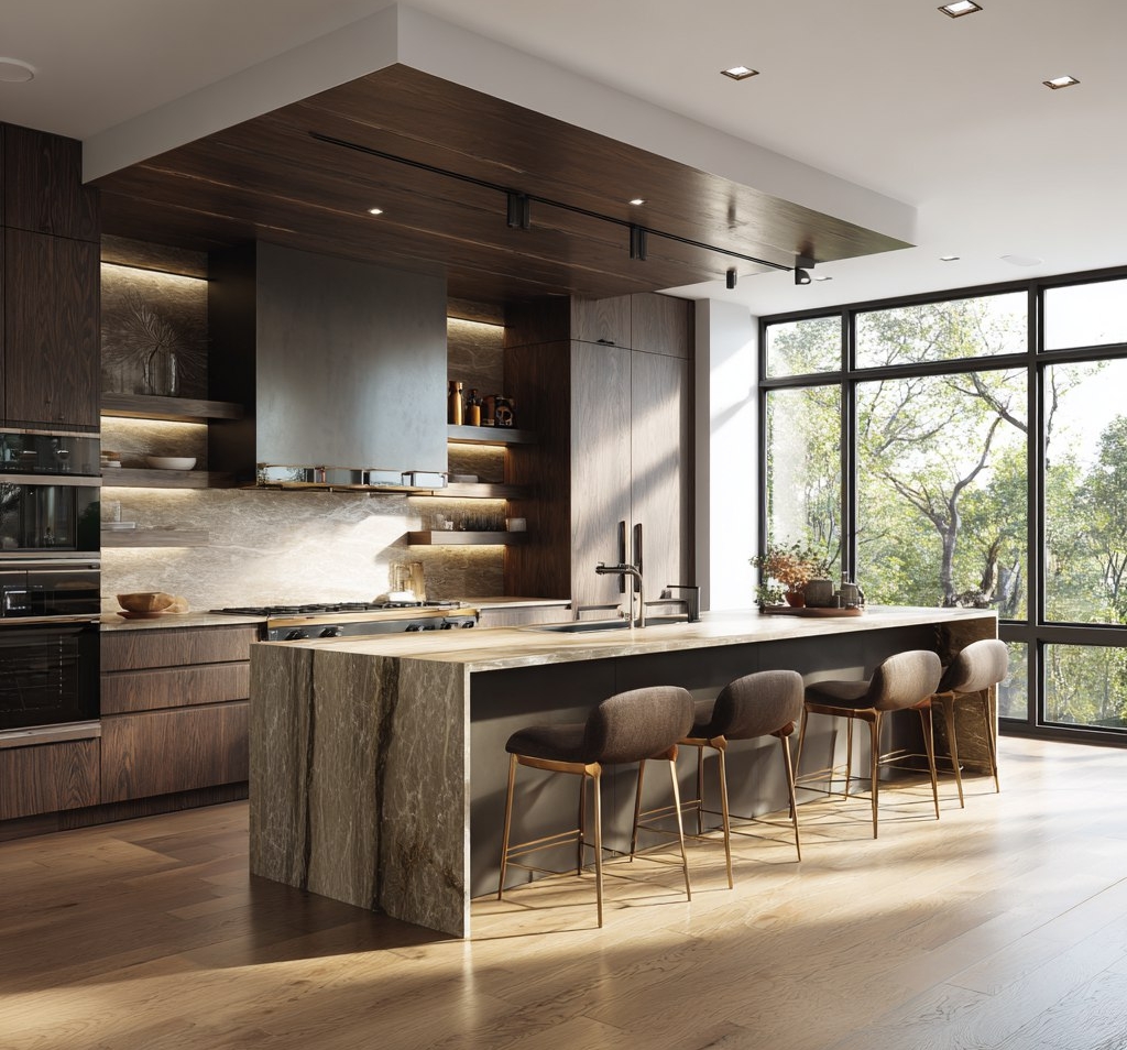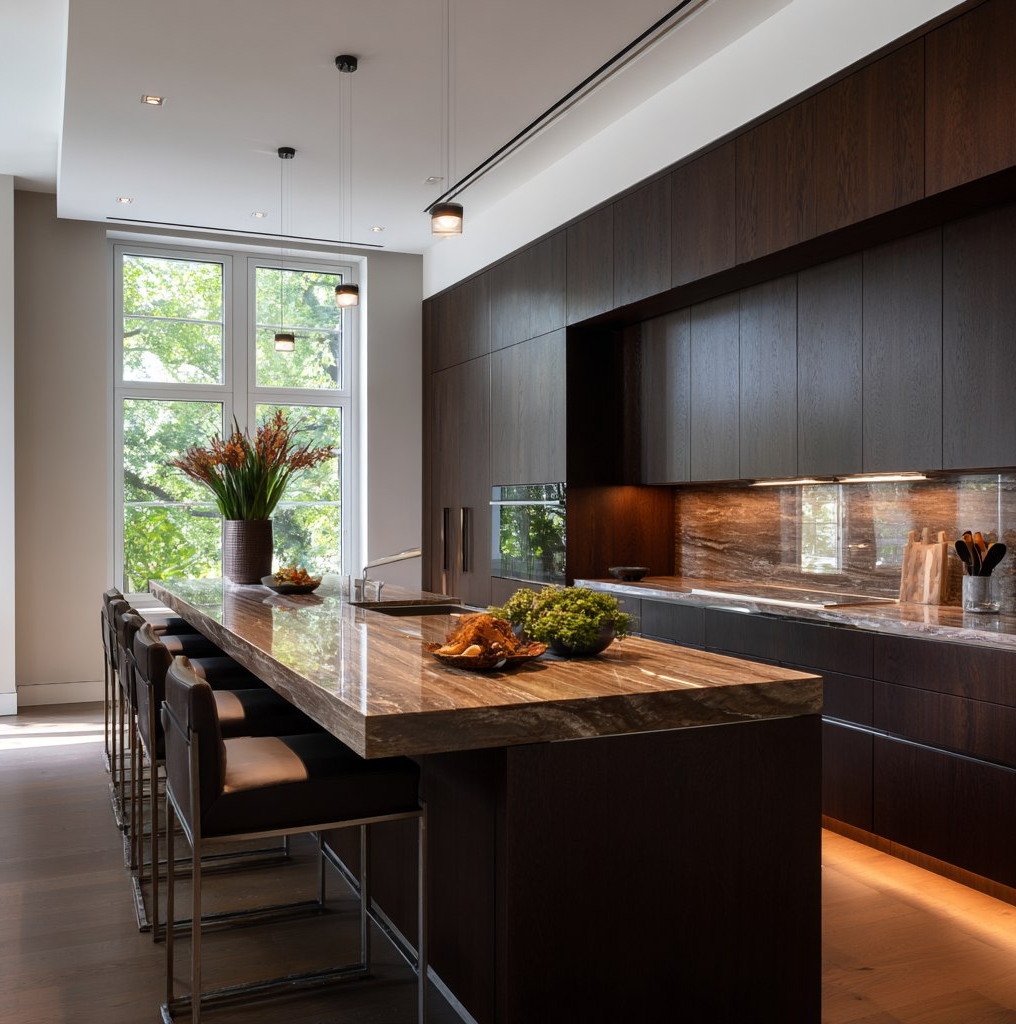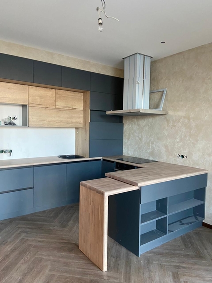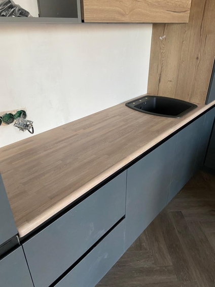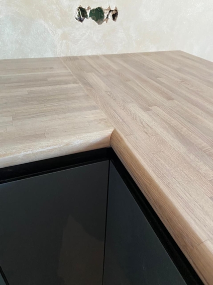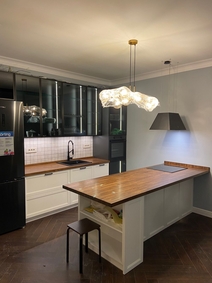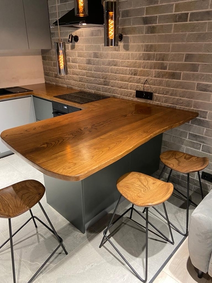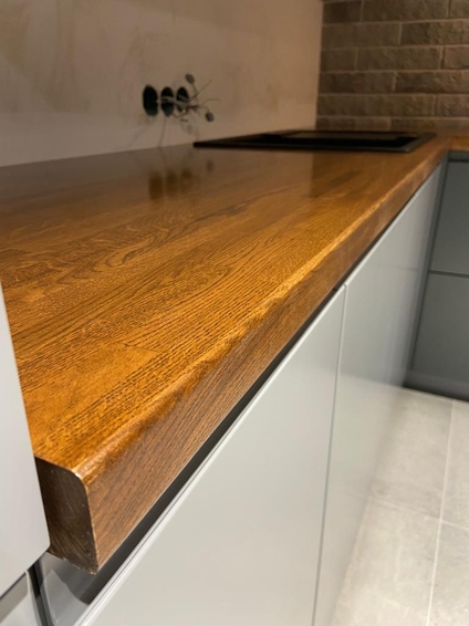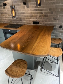 Мы предлагаем изготовление столешницы из массива сращенного или цельноламельного дуба или слэба карагача. Натуральное дерево делает кухню уникальной и подчеркивает её статус, а карагач отличается выраженной текстурой и долговечностью. Возможны индивидуальные размеры, нестандартные решения и форма под ваш проект.
