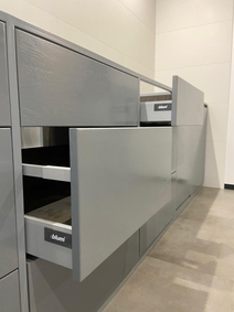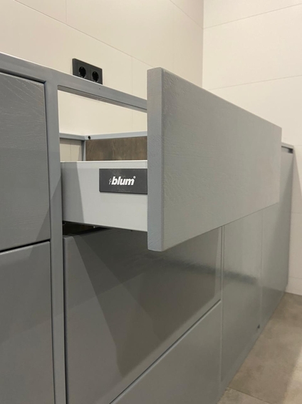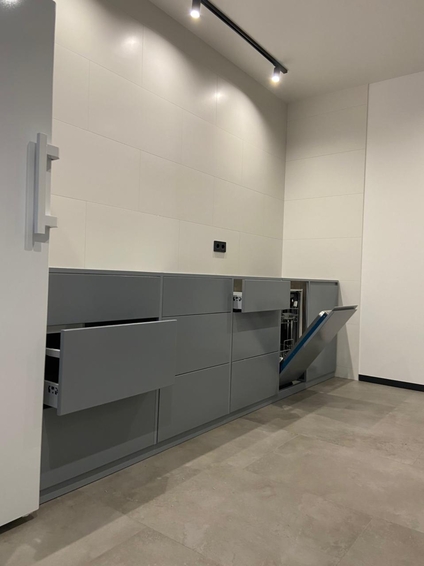 Кухню можно оснастить современными скрытыми направляющими, установить фурнитуру Blum /Hettich push to open, сделать интегрированные ручки в фасаде - любой элемент подбирается по вашим пожеланиям для максимального удобства.